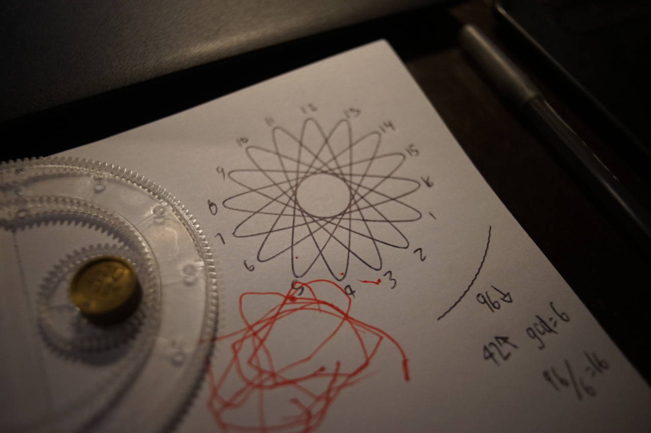 Every letter we send as Hundred Rabbits has a spirograph drawing at the back, I tend to mix and match cogs until I find a pattern I like. For a while now I was wondering if I could guess how many turns it takes to close a line based on the number of teeth and I JUST figured it out. First, I get the gcd(cog, ring), for example gcd(42, 96) = 6, then I take the ring teeth count and divide it by that number 96/6 = 16 turns, works every time.