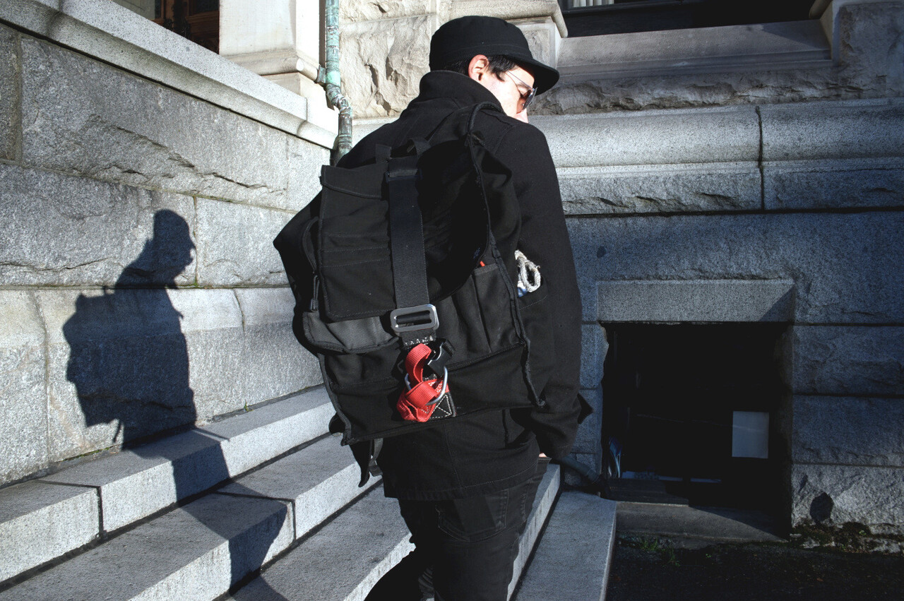 A rebuilt Banjo Brothers backpack. The original bag was over 10 years old and was sun-worn and torn. Devine re-used the straps, front pocket and the liner and re-did the rest. It looks fantastic and will last for many more years.